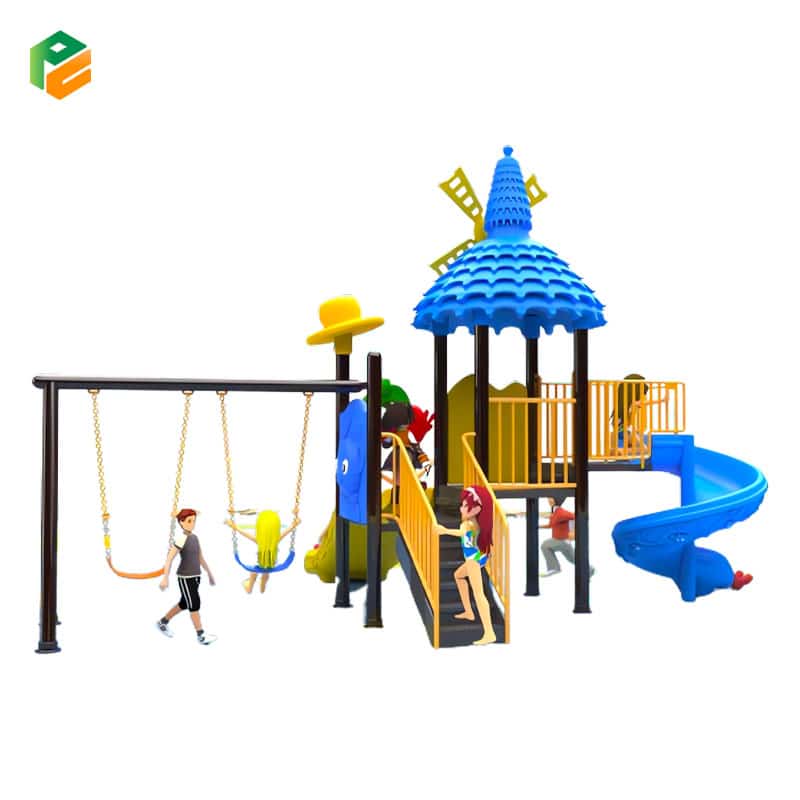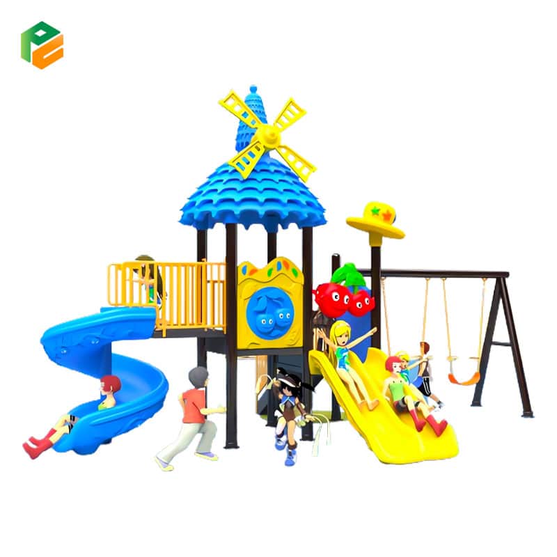 | Core Components | Blue layered/gabled roof topped with a yellow windmill, yellow hat pole topper featuring a star graphic. Yellow double-lane straight slide, blue spiral slide. 2-bay attached swing frame featuring two standard belt/U-shaped seats (orange and blue). Wide-step access stairs with yellow metal safety handrails. Yellow barrier panel featuring a 3D blue character face, blue solid barrier panel, 3D red cherry decorative attachment, and non-slip square platforms |